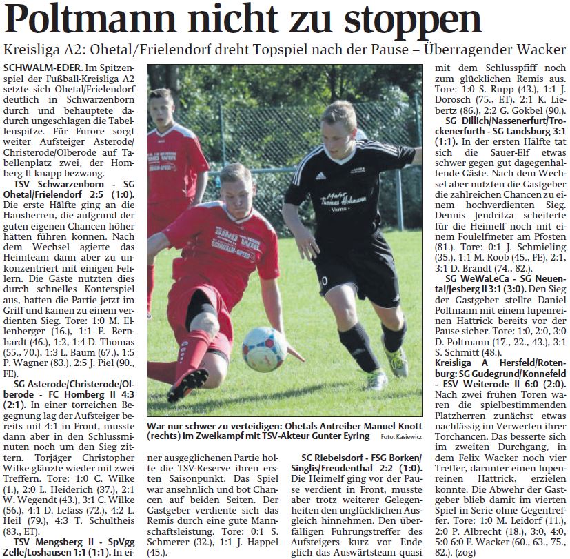 - Diese Fußball-Kreisliga A2 hat jede Woche etwas zu bieten. Zuletzt erneut 28 Tore in sechs Spielen, das entspricht wieder einem Durchschnittswert von 4,6 Toren pro Spiel. Erneut ein lupenreiner Hattrick, diesmal durch Daniel Poltmann von der SG WeWaLeCa und sieben Tore im Spitzenspiel, indem der Tabellenführer aus Ohetal/Frielendorf mit 5:2 deutlich beim TSV Schwarzenborn siegen konnte.