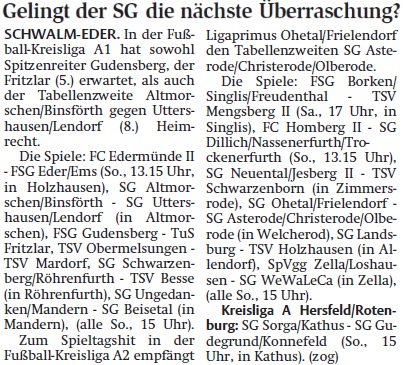 +++ Senioren aktuell: Vorberichte Kreisliga A - HNA vom 16.09.2016 +++