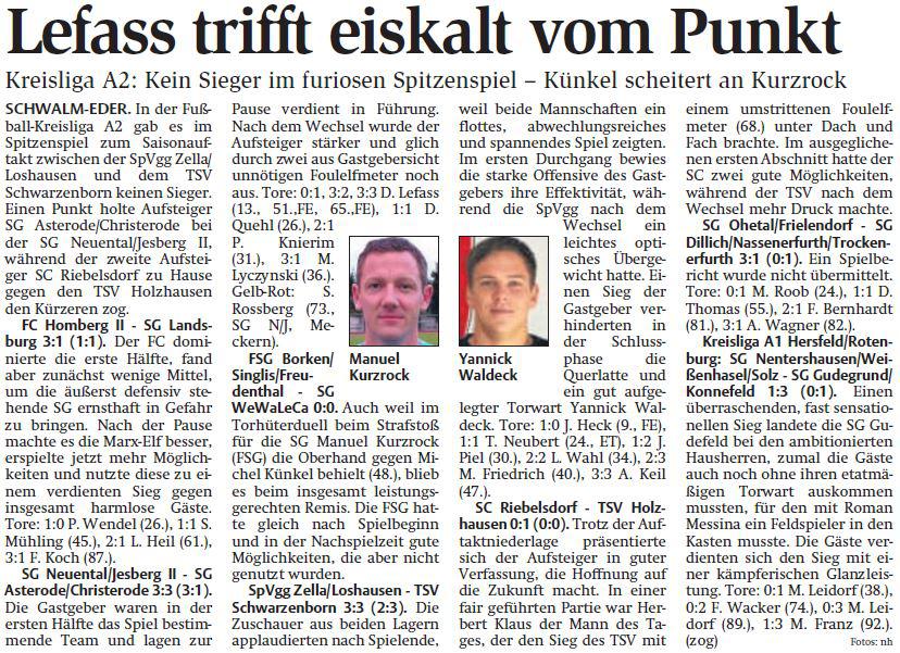 - Am Wochenende kommt es zum zweiten Spieltag in der Fußball-Kreisliga A2 und diese Liga hat wahrscheinlich nicht nur unsere Redaktion am ersten Spieltag überrascht. Unsere Favoriten aus Zella/Loshausen und Schwarzenborn konnten sich im gegenseitigen Kräftemessen keine volle Punktzahl abluchsen und der TSV Holzhausen hat sich beim Liganeuling in Riebelsdorf alles andere als leicht getan, um am Ende glückliche drei Punkte mit nach Hause nehmen zu können.