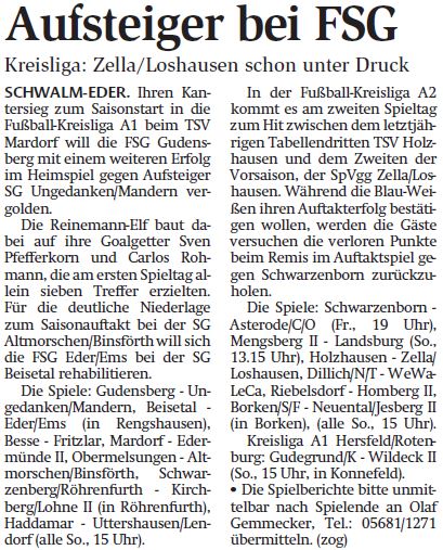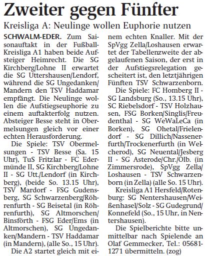 +++ Senioren aktuell: Vorberichte Kreisliga A - HNA vom 05.08.2016 +++