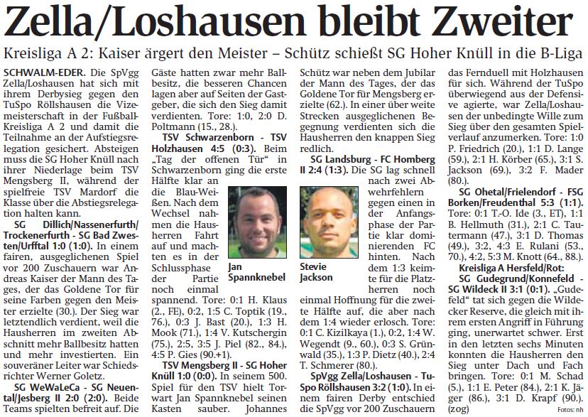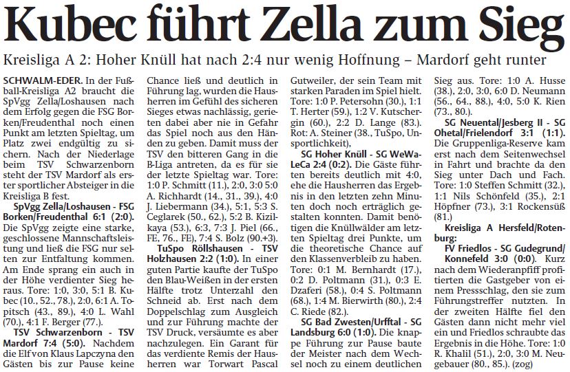 - Spielberichte vom WochenendeSG Dillich/Nassenerfurth/Trockenerfurth - spielfrei. In der Fußball-Kreisliga A2 braucht die SpVgg Zella/Loshausen nach dem Erfolg gegen die FSG Borken/Freudenthal noch einen Punkt am letzten Spieltag, um Platz zwei endgültig zu sichern. Nach der Niederlage beim TSV Schwarzenborn steht der TSV Mardorf als erster sportlicher Absteiger in die Kreisliga B fest. | |||||||||||||||||||
