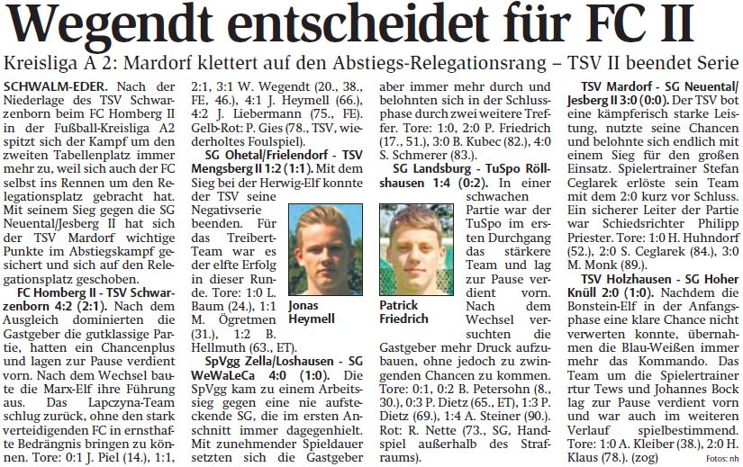 - Spielberichte vom WochenendeSG Dillich/Nassenerfurth/Trockenerfurth - FSG Borken/Freudenthal verlegt auf 04.05.2016 Nach der Niederlage des TSV Schwarzenborn beim FC Homberg II in der Fußball-Kreisliga A2 spitzt sich der Kampf um den zweiten Tabellenplatz immer mehr zu, weil sich auch der FC selbst ins Rennen um den Relegationsplatz gebracht hat. Mit seinem Sieg gegen die SG Neuental/Jesberg II hat sich der TSV Mardorf wichtige Punkte im Abstiegskampf gesichert und sich auf den Relegationsplatz geschoben. | |||||||||||||||||||