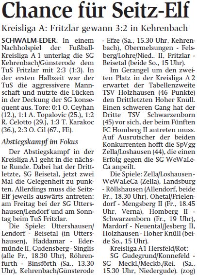 +++ Senioren aktuell: Berichte Kreisliga A - HNA vom 03.05.2016 +++